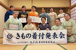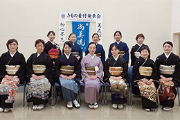 各支部/学園ごとに行う年に一度のきもの着付発表会。鏡を見ないできものを着る。それを、あたりまえのことにしてしまうのがこの機会。留袖/振袖/訪問着に袋帯の着付けと、訪問着に袋帯、おしゃれ着に名古屋帯の着せ付けの各部門で日頃のお稽古の成果を披露します。指導者の技術展示も見逃せません。