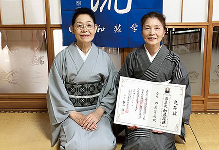 橋本陽子さん(右)、野崎 浩子さん(左)が和装弐級のお免状を取得されました。