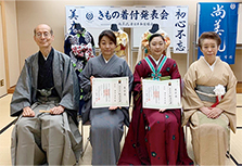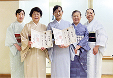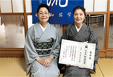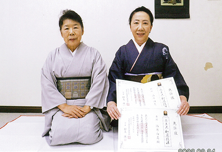 田中 芽衣さん(右)と田中 由紀さん(左)が和装参級のお免状を松嶌会長から授与していただきました。