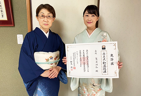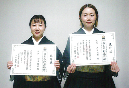 上田 亜希さん(右)と野中 優理さん(左)が和装弐級のお免状を取得されました。