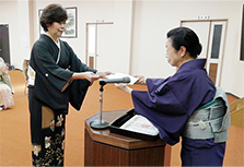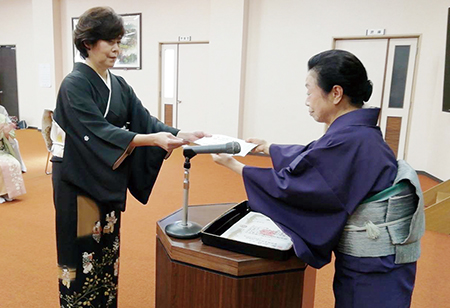 蔵田 さつきさんが和装参級のお免状を竹田副会長から授与していただきました。