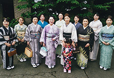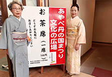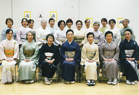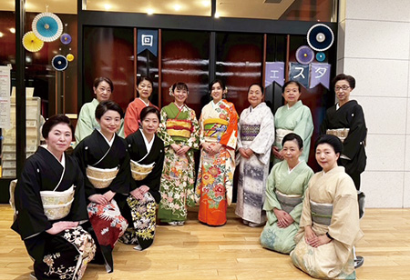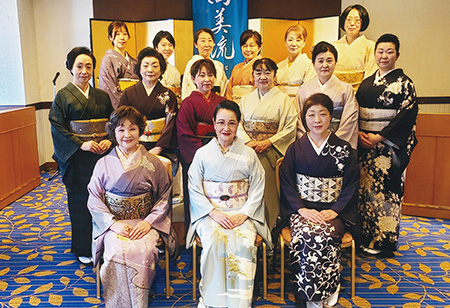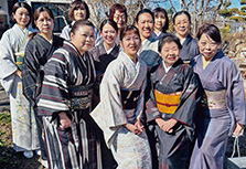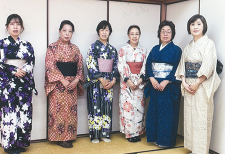 支部の有志で、留袖目隠し着付け、振袖などの帯結びを展示。舞台の上でのお客さまへの披露は、とても緊張しましたが、目隠しに感動されたり、展示後には帯結びを「よく見せて」と大好評。文化交流のいい思い出です。
